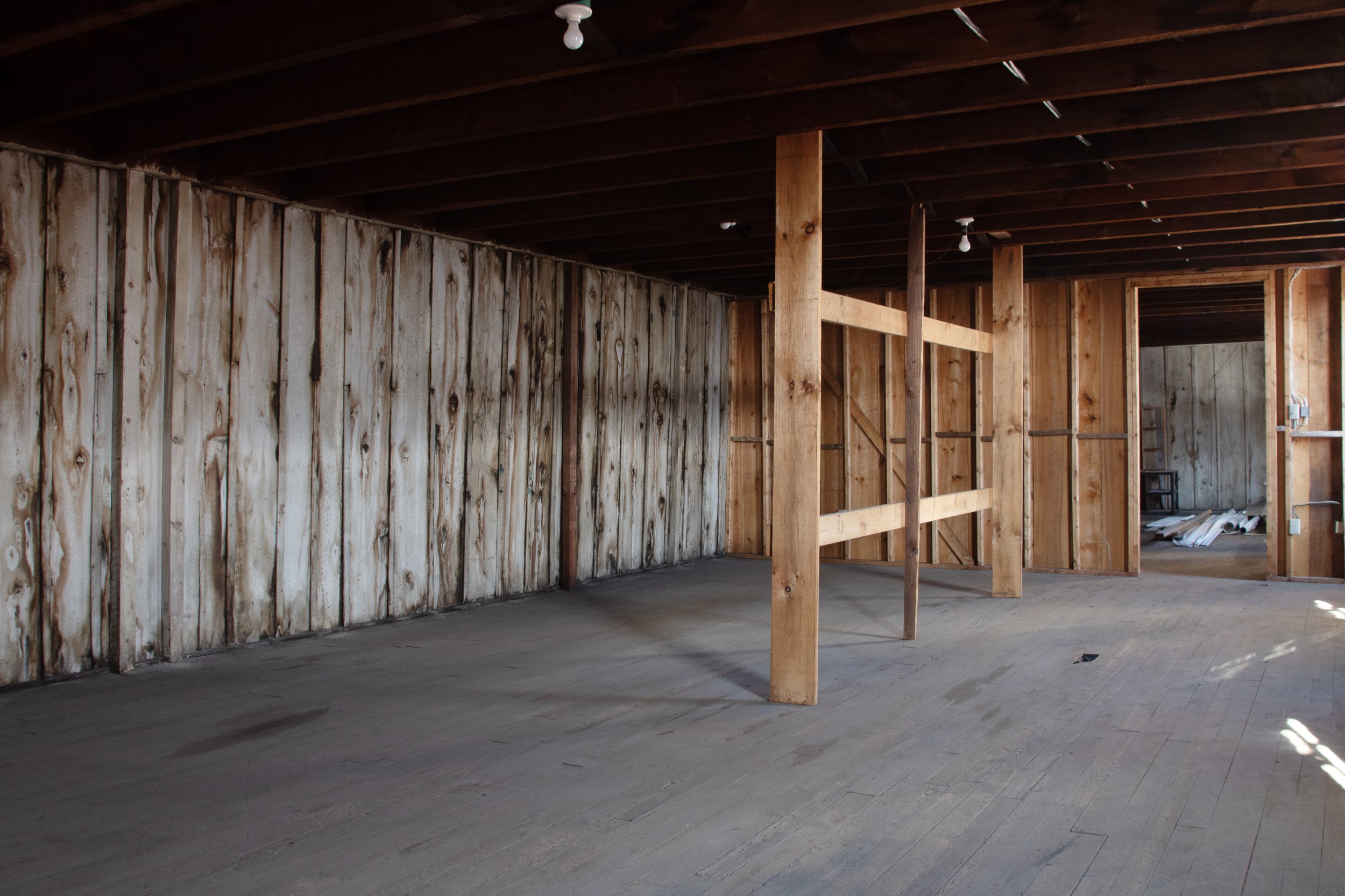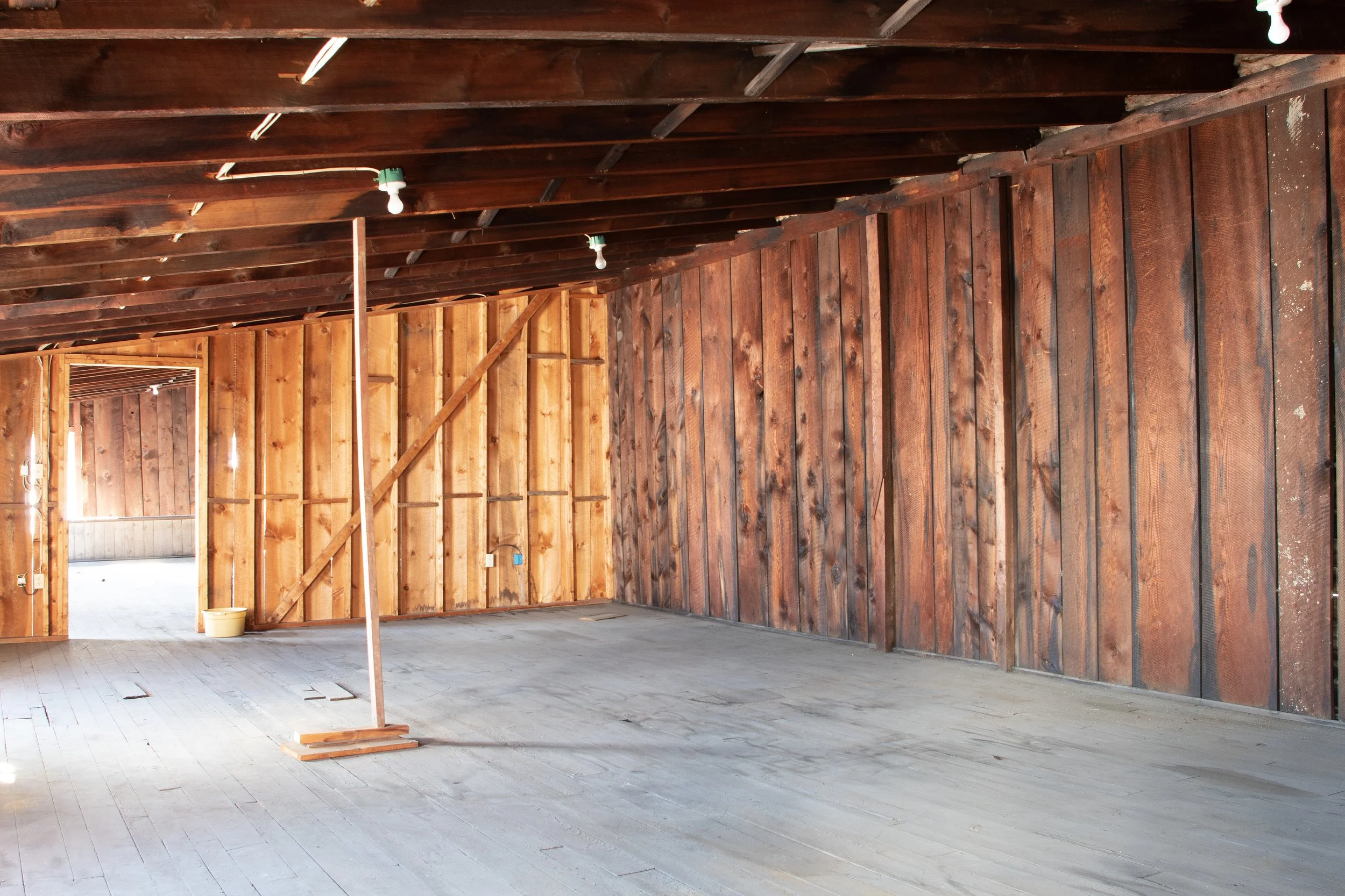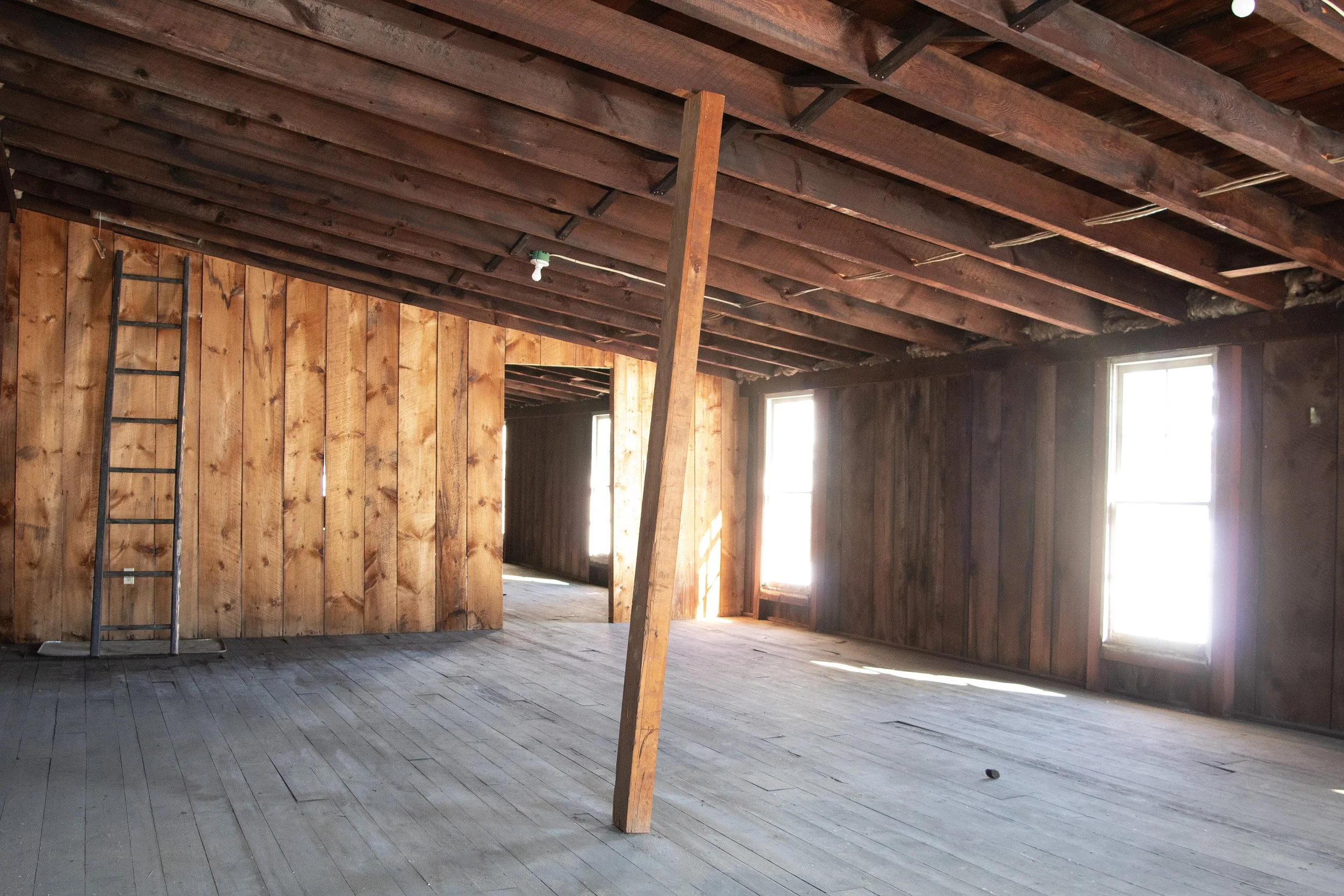 The summer session workspaces are located within a separate building on the property called the Lumber Shed. This building has five semi-private spaces, all divided by walls but no doors. There is a bathroom and slop sink in the building. Folding tables (one 6 ft, one 4 ft) and chairs are provided in each workspace. The workspaces are not climate controlled, so please keep this in mind. We provide box fans and window screens. To access the workspaces, artists must walk around the block and climb one or two sets of stairs to reach their assigned space. Each workspace is approximately 550-680 sq ft. The walls are made of bare unfinished wood and the floors are also wood. This space is raw and unfinished and is prone to the occasional bug!