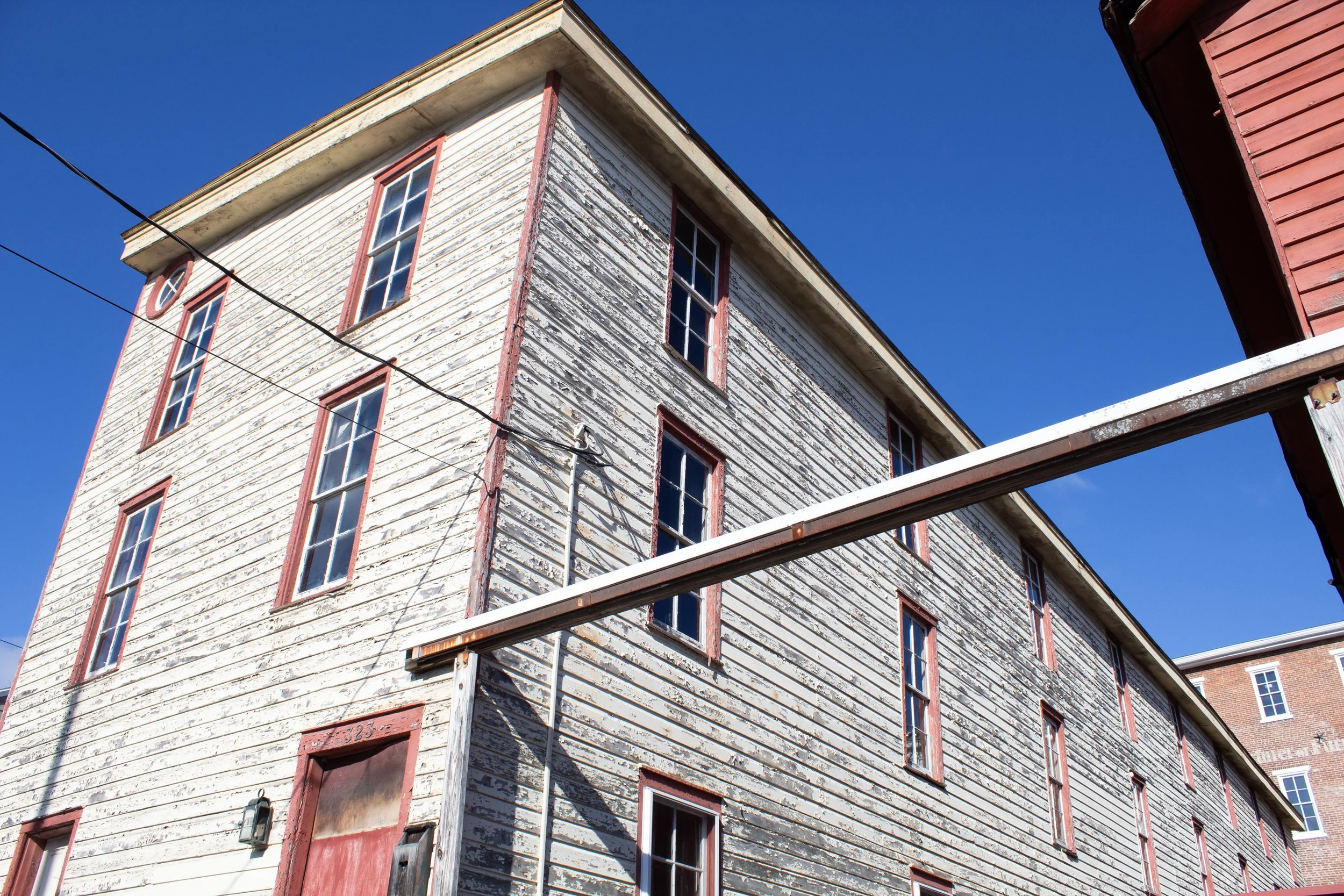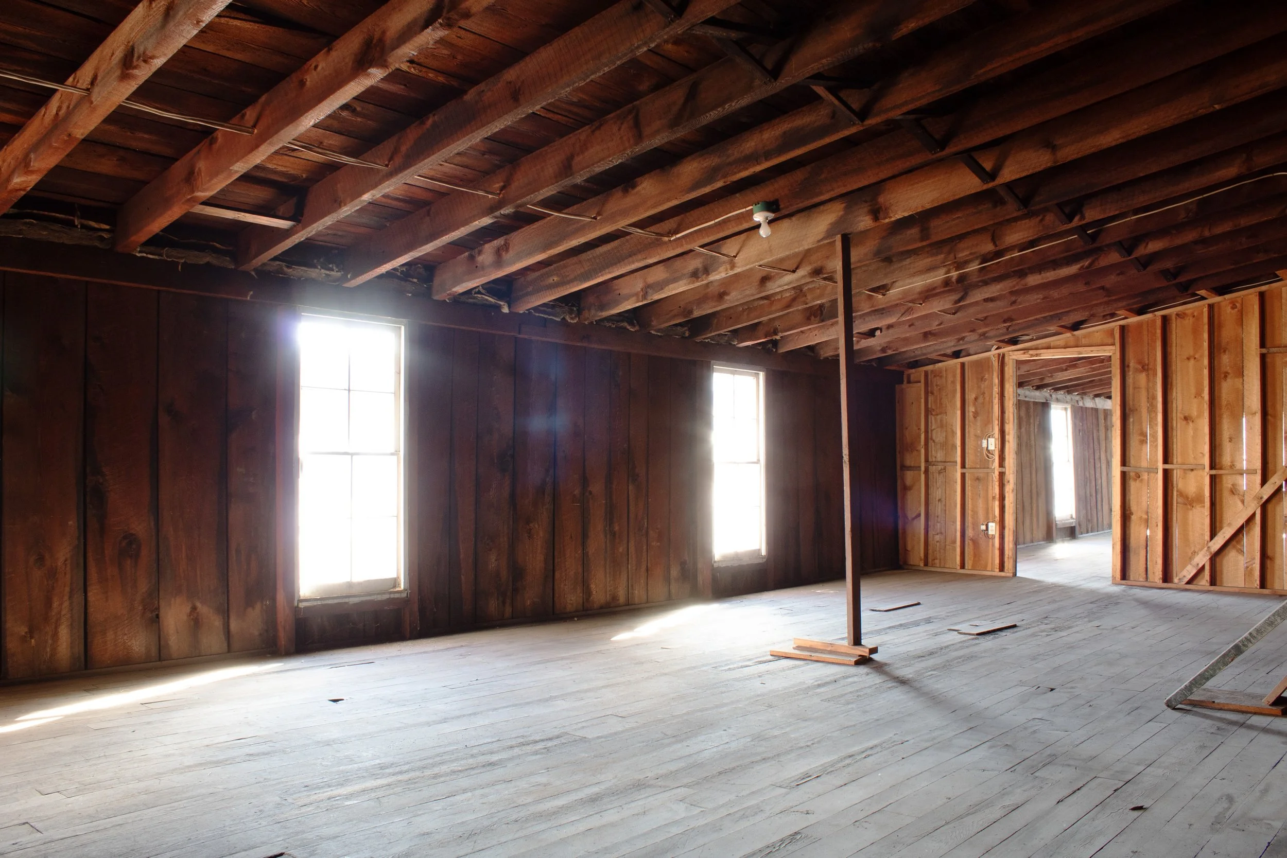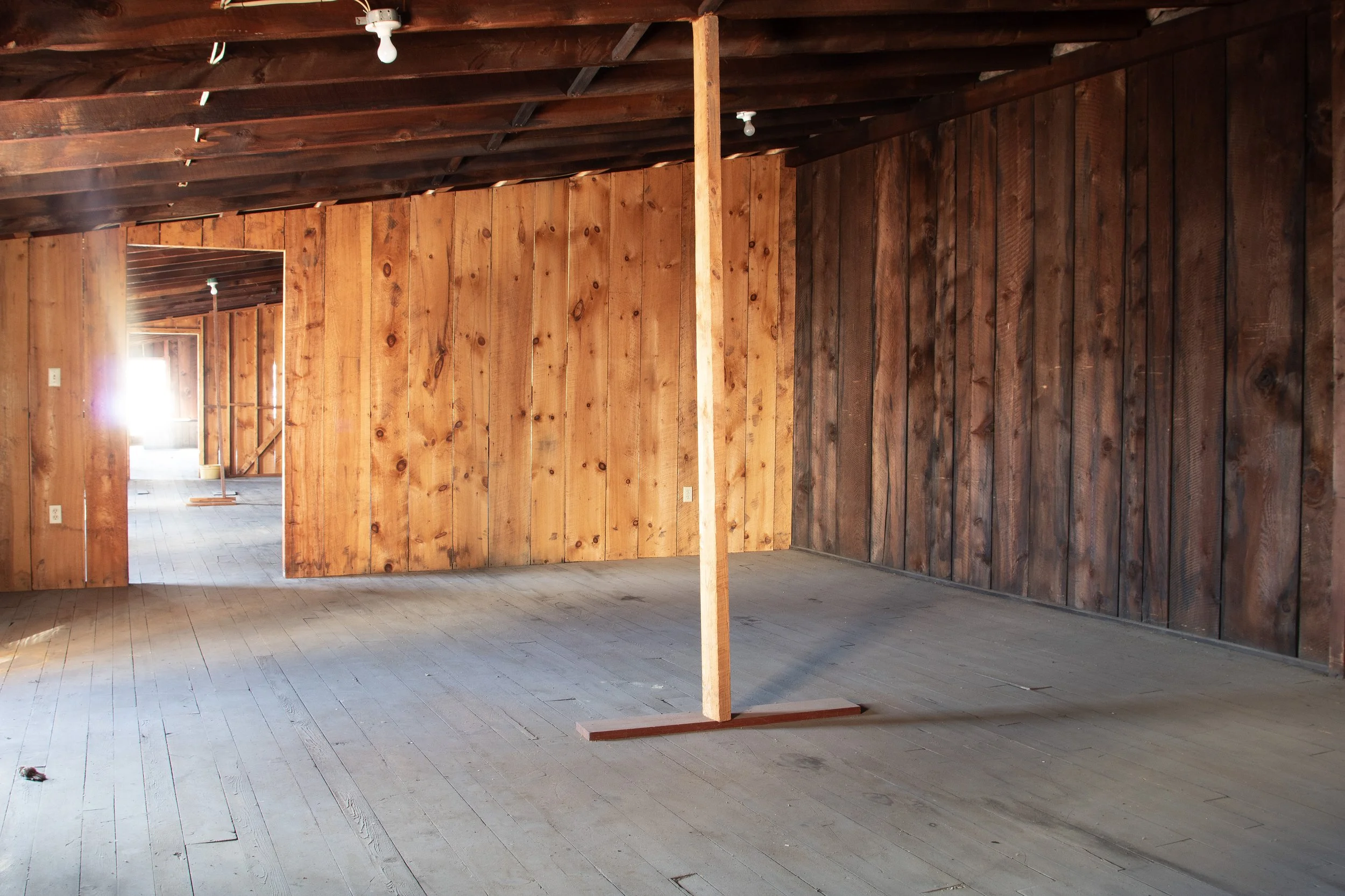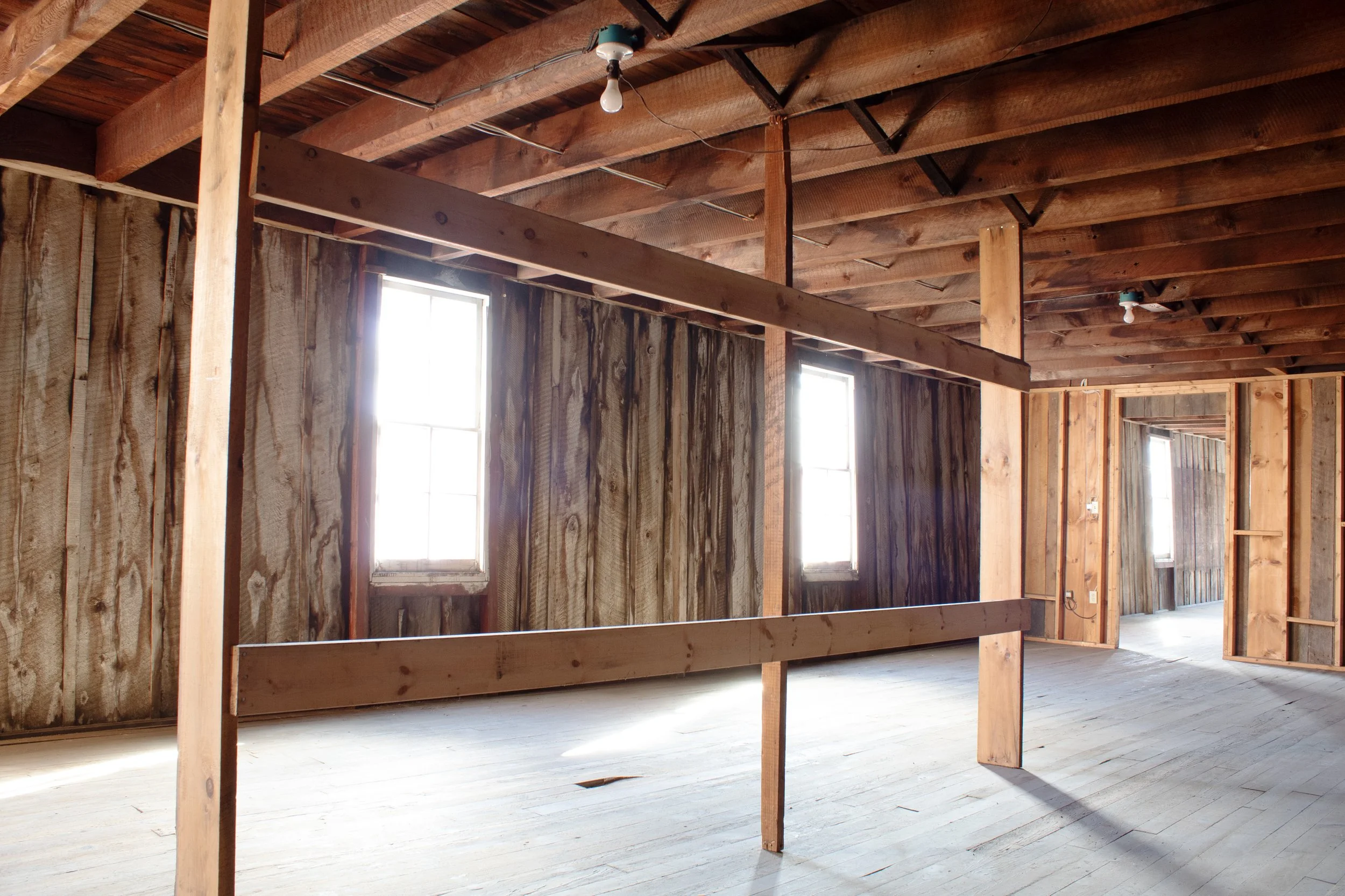 The summer session workspaces are located within a separate building on the property called the Lumber Shed. This building has five semi-private spaces, all divided by walls but no doors. There is a bathroom and slop sink in the building. Folding tables (one 6 ft, one 4 ft) and chairs are provided in each workspace. The workspaces are not climate controlled, so please keep this in mind. We provide box fans and window screens. To access the workspaces, artists must walk around the block and climb one or two sets of stairs to reach their assigned space. Each workspace is approximately 550-680 sq ft. The walls are made of bare unfinished wood and the floors are also wood. This space is raw and unfinished and is prone to the occasional bug!